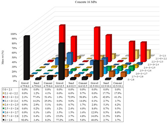 Figure 5 presents the density distribution of coarse aggregate, sand, and cement paste particles (concrete substrate composition) in different size ranges for concrete 16 MPa.