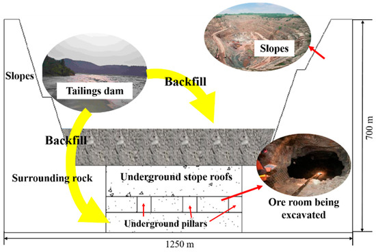 Due to the open pit and high-steep slope caused by the open-pit mining shown in Figure 2, a great risk threatens the entire excavation process of lower ore bodies. This process may also affect the stability of the slope [11]. Accordingly, it is necessary to consider the stability of underground stopes (including roofs and underground backfill pillars) and the slope to prevent geological disasters. In engineering practices, tailings, cement and mixing water in a certain proportion are transported to the filling slurry preparation station through pipelines to prepare homogeneous slurry by utilizing mixing equipment, which will be transported to underground stopes and the open-pit through the pipeline system.