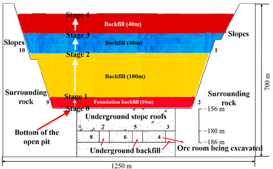 In the studied mine, a two-step mining method was utilized. The first step consists of a 15 m wide room, followed by a 10 m pillar in the second step, which perceives excavated pillars from bottom to top in a layered form. Then, CPB is filled to create a platform, allowing upward mining operation. Figure 2 presents the schematic diagram of the studied open pit. When pillars are mined and filled by CPB, the same process is performed to excavate the CPB-filled room. It should be noted that the ore bodies to be excavated are below the −156 m level. In particular, the ore bodies in the middle section of −380 m are mined first, and then the middle section of −320 m, −270 m, and −230 m is mined, respectively, leaving a boundary pillar of 24 m high between the −180 m and −156 m levels.