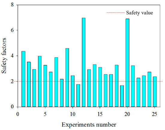 In Figure 6 and Supplementary Table S4, it should be noted that the values of safety factors in scheme 11 and 19 are lower than safety value, which is defined as the optimum factor of safety (The safety value is 2) according to safety requirements, demonstrating that these two options should not be allowed in situ application. However, obtained results show that OPB in underground mining does not threaten roofs, although certain stress and displacements are produced during this process [31].