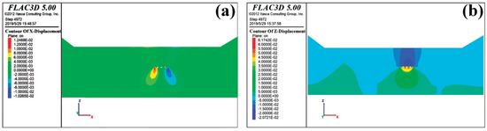 Figure 7 shows the overall displacement distributions of the model established in the horizontal and vertical directions. Figure 7a,b show that subsidence is inevitably caused on the roofs with the excavation of underground ore bodies, which is consistent with the results obtained by previous studies [29,30]. Moreover, it is found that the maximum downward displacement, which is 6.18 cm, is obtained at the center of the roofs corresponding to the center of stopes, which gradually decreases towards both sides.
