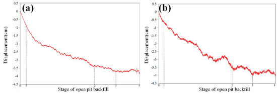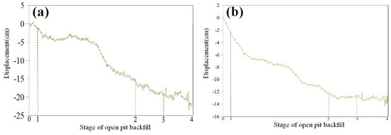 Figure 7 shows that no obvious displacement is produced on the slopes of both horizontal and vertical directions. This is the result of the reinforcement for slope foot given by overlying CPB, enhancing the anti-sliding force of the slopes. Therefore, the structure is more stable. The mechanism of stability and safety is discussed in the related literature [36].