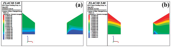 Figure 11 presents the maximum and minimum principal stress distributions of the slopes of the open pit in the present study. In order to facilitate modeling, the inclination of the slope in Figure 11 does not seem to be as steep as that in Figure 2 and Figure 5. Since it does not affect the final analysis, this difference can be ignored. It is observed that stress is mainly concentrated at the slope foot. However, the stress (1 MPa) can be found at the top of the slope, which conforms to the general principle of slope deformation [11]. As the height of OPB continuously increases, the stress concentration becomes more apparent and is accompanied by the expansion of the radiation range. Moreover, it is found that compressive stress is distributed in layers in the direction of gravity, which is consistent with the general discipline of compressive stress field distribution described by relevant literature [34]. Despite the concentration of the compressive stress in the slope foot, the overall structure can remain stable and does not cause hazards to the sloping rock, which is consistent with the previous study [35].