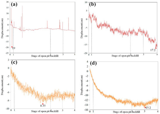 Figure 12a shows that during stages 0 to 2, the vertical displacement gradually increases, and then becomes stable accompanied by sharp increments in displacement, which can reach up to 19 cm. This phenomenon is explained by errors during data measurement. The displacement fluctuates slightly and subsequently levels off. Therefore, when the height of OPB reaches a certain value, it acts as a support for the slopes on both sides which is, in turn, responsible for the gradual disturbance reduction on the slopes. Figure 12b shows that with the continuous filling of the open pit, the horizontal displacement of point 1 is sensitive to the change of the backfill height to a great extent, resulting in a continuous increase in the displacement. Moreover, it is found that the horizontal displacement fluctuates more than the vertical displacement of point 1. This phenomenon accounts for the fact that the slope angles on both sides affect part of the stress provided by the overlying CPB.
