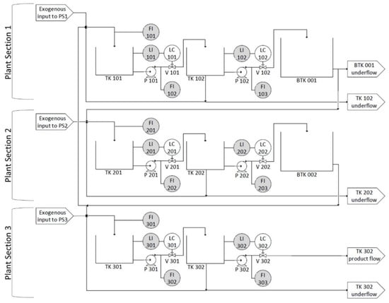 Figure 2. The tank network was developed to represent a plant with three PSs that have identical configurations and are separated by buffer tanks (BTK 001 and BTK 002). A detailed description of PS1 is therefore provided, followed by a description of the interaction between the PSs. In addition, the one-tank model development is provided as