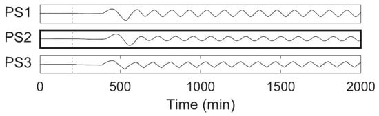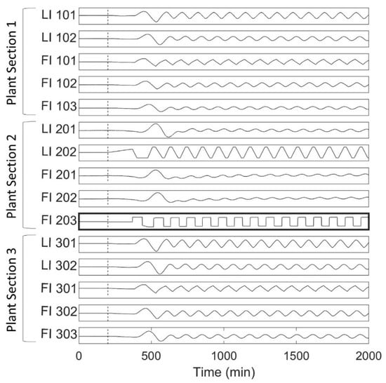 Figure 3, where PSs are indicated by open brackets on the left-hand side and the first number in each tag name indicates its PS. The valve stiction begins at 200 min, as indicated by the dashed line in