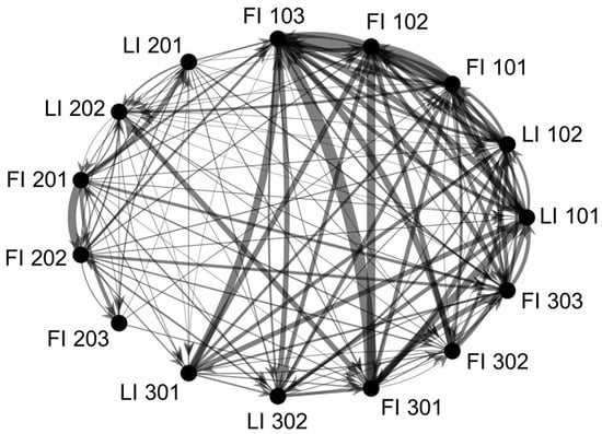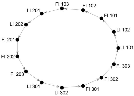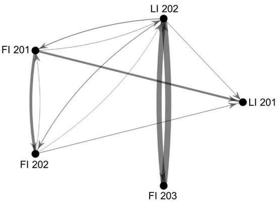 Figure 9), therefore consists of all variables in PS2 that show an effect of the fault. This causality map is also cyclic, so the root cause should be identified as a node with a large causal influence, which can be identified by observing the nodes adjacent to heavier edges (i.e., strong causal connections, large value of G-causality index defined in Equation (3) in