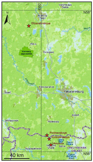 In 1978–1979, one of the authors of this study, A.K., conducted a study of the Poldnevskoye demantoid deposit. This served as the beginning of the systematic prospecting for the demantoid in the Middle Urals, which resulted in the discovery of the Korkodinskoye deposit. Later, the mineralization of the demantoid was established in the Verkhneivinskiy ultrabasic massif (the Central Urals, 50 km north-west of Ekaterinburg) [2], in the Polar Urals [3], on the Koryak highlands, and on the Kamchatka [4]. Demantoids are also known to be present in Italy [5,6], Azerbaijan [7], Iran [8], Pakistan [9], the United States of America, China [10], Slovakia [11], Namibia [12], and Madagascar [13,14].