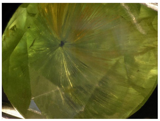 “Horsetail” inclusions are represented by hair-like formations of various sizes assembled in fan or sheaf-like bundles tapering toward the central part of the grain. Closely spaced inclusions form larger and denser formations. “Horsetail” inclusions may begin in the center of the grain from an inclusion of a dark ore mineral (chromospinel or magnetite, see Figure 2), or without a central inclusion. Sometimes “horsetail” inclusions start from a facet of the phantom, which can reflect (Figure 7a). “Horsetail” inclusions are often gathered not in a bundle (horsetail), but in a fan (Figure 7b). This can be seen especially well on the facets of the stone. They can start at any depth of the stone, with shallow “horsetail” inclusions often being v-shaped (Figure 7c). They are usually colorless and transparent, while in the demantoid from alluvial placers, horsetail inclusions are usually colored ochre-yellow (Figure 7e,f). In the stones that underwent high-temperature annealing (to improve the coloring), the inclusions sometimes acquire a dark brown coloring and lose transparency (Figure 7c,d). It is important to note that small disc-shaped cracks are not characteristic for annealed stones, although these cracks are a sign of heat treatment of the gemstones. The “horsetail” inclusions on the polished facets near the surface are dark colored and opaque (Figure 7g), which is due to process dirt.