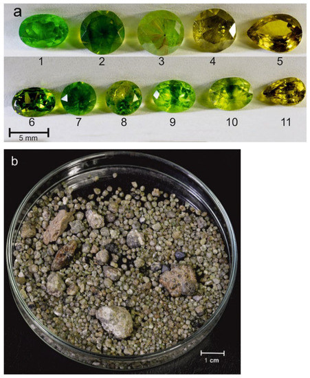 The faceted demantoids (Figure 4a) were borrowed from the collection of A. Kissin. Samples of untreated (rough) demantoid (Figure 4b) were obtained during the exploration work carried out by one of the authors (A.K.) in the Poldnevskoye deposit in 1978–1979. Additional materials were collected by the authors during visits to the Poldnevskoye and Korkodinskoye deposits in 2018–2020.
