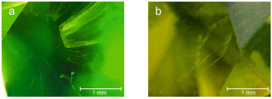 At present, the gem demantoids related to (1) the massif of ultrabasic rocks (the Urals type) and (2) the skarns (the Namibian type) are recognized. The Ural demantoids are characterized by horsetail inclusions, which are hair-like inclusions that diverge in bunches from the central part of the grain to its periphery (Figure 2). These inclusions became the key markers for identifying the demantoid and determining its geographical origin [15,16,17]. Horsetail inclusions were first discovered in the Ural demantoids, as these inclusions are: (1) always present, (2) numerous (the gem can completely lose its transparency), (3) often large and easily detected by the naked eye, and (4) sometimes colored in ochre and clearly visible. In spite of this, there is no consensus among researchers as to the origin or composition of these inclusions. Initially it was assumed that they were byssolite (actinolite-asbestos) and, under this name, they were mentioned in geological reports and articles [3,15,18]. In 1992, at the International Gemological Conference (Paris), Gübelin (Switzerland) reported that he managed to analyze these inclusions in a demantoid from Val Malenco (Italy) by the X-ray diffraction method, and determined their chemical composition to be chrysotile (a serpentine group mineral) [19]. These results were confirmed by microprobe analyses [20]. Chrysotile was also detected in the demantoid from Balochistan (Pakistan) [21].
