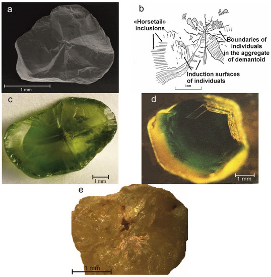 “Horsetail” inclusions often have a fan-shape, in the plane of which induction surfaces are sometimes observed (see Figure 8a–d), and the demantoid grains themselves have an aggregate sectoral structure. It is the sectoral growth of the demantoid crystals that explains the appearance of “horsetail” inclusions. Even in well-formed crystals (see Figure 6), the sectoral structure is observed (Figure 8a,b).