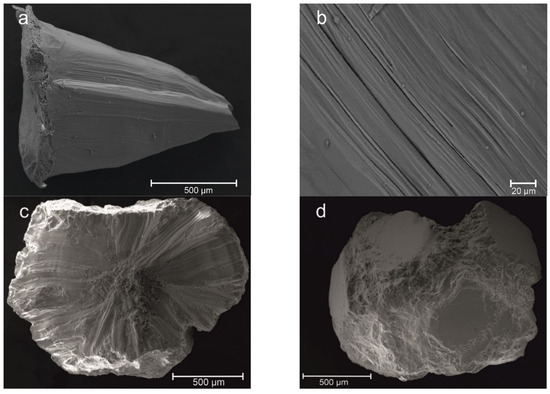 The study of hair-like inclusions on fresh chips of the Ural demantoid grains under an electron scanning microscope showed very interesting results. Even the seemingly monocrystal andradite (see Figure 5) had an aggregate structure. When crushing such a crystal, many fragments were cone-shaped (Figure 9a) with thin longitudinal grooves and knolls. Note also the transverse irregularities (steps) enveloping the cone, which are characteristic of the induction surfaces of crystals. The longitudinal section of “horsetail” inclusions is shown in Figure 9b: many subparallel grooves of different lengths and depths were observed; there were split and relatively short grooves which disappeared in both directions.