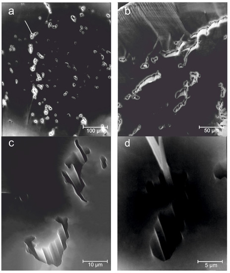 The mineral composition of the “horsetail” inclusions was not detected, or they were represented by single inclusions, which were not identified due to their small size (Figure 10a,d). The vast majority of the “horsetail” inclusions were hollow channels (Figure 10). The configuration of their sections was very bizarre, but closest to slit-like (Figure 10b). The walls of the channels were corrugated, resembling the faces of negative crystals (Figure 10c,d).