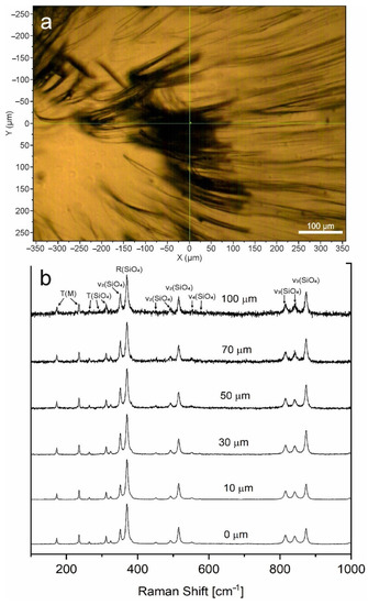 Raman spectrum of the Demantoid from the Poldnevskoye deposit: (a) optical image of the “horsetail” inclusion in the demantoid (thin sections); and (b) Raman spectra of inclusions in the depth range of 0–100 µm.