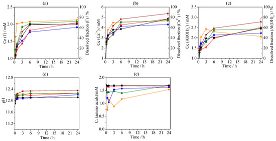 The changes in I−, Ca2+, Al(OH)4−, pH, and amino acids at different suspension time intervals are shown in Figure 2. Without any amino acids, after I-hydrocalumite was suspended in an alkaline solution for 0.5 h, and the leaching amount of I− reached 50.0% of the total amount in pristine I-hydrocalumite. As the reaction time continued, the concentration of the released I− reached 2.00 mM (91.0%) and the dissolution equilibrium was almost achieved after 6 h. The concentrations of the released Ca (Figure 2b) and Al (Figure 2c) reached 5.37 and 2.78 mM after 24 h, respectively. In addition, the ratios of released Ca/Al were always within 1.85–1.95 which were close to the Ca/Al ratio in pristine I-hydrocalumite. This indicates that the metallic hydroxide layer structure of I-hydrocalumite easily enabled simple dissolution, even though it was under strongly alkaline conditions (Equation (3)).
