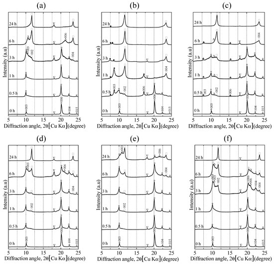To verify the dissolution equilibrium, the reactions in this work were continued until the 24 h mark. The XRD patterns of solid residues collected from blank and amino acids tests at different reaction times are presented in Figure 3. Figure 3a shows the results of the blank test, where the phase of I-hydrocalumite was maintained for 3 h, and, after that, it was gradually phase-transferred into the metastable phase of calcium aluminum oxide hydrate (4CaO·Al2O3·xH2O, PDF#02-0077) and 3CaO·Al2O3·xH2O, PDF#02-0083). After 6 h, the phase of 4CaO·Al2O3·xH2O completely disappeared and 3CaO·Al2O3·xH2O became the end-product, but the Ca2+ and Al(OH)4− concentrations were kept constant, which indicated that ion-exchange of I− with OH− also happened in the simple dissolution process.