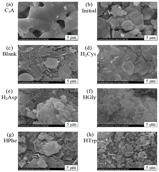 SEM images of (a) tricalcium aluminate (C3A), (b) original I-hydrocalumite and solid residues after suspension of I-hydrocalumite in different solutions for 24 h. (c) Blank, (d) H2Cys, (e) H2Asp, (f) HGly, (g) HPhe, and (h) HTrp.