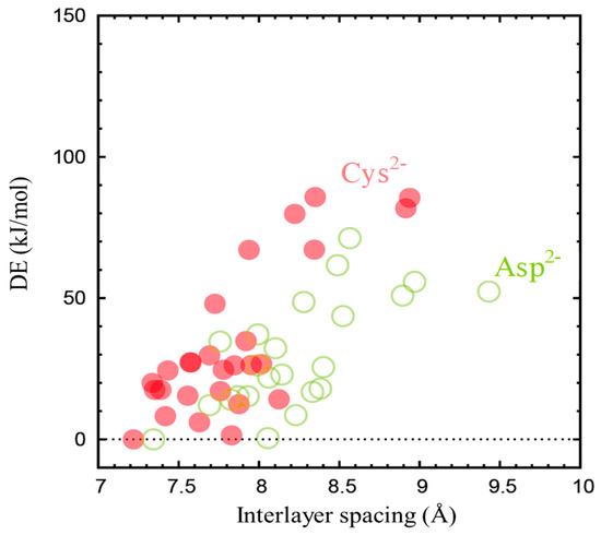 Energy difference (DE) plotted against interlayer spacing for hydrocalumite(Asp/Cys) after intercalation of Asp2− (green circles) and Cys2− (red circles).