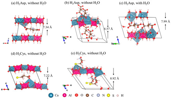 Considering different configurations of Cys-hydrocalumite and Asp-hydrocalumite, total formation energies were plotted against their interlayer spacings (Figure 5). There was a positive correlation, which indicated that the total formation energies of the system also increased with the increase in interlayer distances. Higher formation energy means a more unstable system. Here, we selected the most stable and most unstable systems, which possessed the lowest and highest total energies, respectively. In Figure 6a, the most stable configuration Ca4Al2(OH)12·Asp (0 kJ/mol) showed an interlayer distance of 7.34 Å with one Ca-O bond and seven hydrogen bonds in one unit cell. In Figure 6b, the most unstable system Ca4Al2(OH)12·Asp (71.2 kJ/mol) showed a layer spacing of 8.57 Å with one Ca-O bond and six hydrogen bonds between the metal hydroxide layers and Asp2− in one unit cell. For H2Cys, the most stable system of Ca4Al2(OH)12·Cys with a formation energy of 0 kJ/mol showed a 7.22 Å interlayer spacing including one Ca-O and three hydrogen bonds between metal hydroxide layers and Cys2− (Figure 6d). The most unstable system, Ca4Al2(OH)12·Cys, showed 8.92 Å of interlayer distance in 85.6 kJ/mol (Figure 6e). From these results, the simulations predicted a much lower interlayer spacing than the observed XRD results (Figure 3b,c). As can be confirmed, the water molecules can cause the expansion of the interlayer spacings in experimental results [44,45]. Thus, we considered a new system, which included one water molecule in one unit cell of hydrocalumite including Asp2−, as shown in Figure 6c. In the system of Ca4Al2(OH)12Asp·4H2O, the corresponding interlayer spacing was 7.99 Å under the lowest formation energy of 0 kJ/mol, which indicated that the presence of water molecules can affect the expansion of the interlayer distances. Therefore, in a real system, the most stable state is possibly overlapped by the d003 peak in XRD, assigned to 3CaO·Al2O3·CaI2·10H2O in 11.6°, 2θ. The XRD diffraction peaks at 8.54° (2θ), 7.61° (2θ), and 7.92° (2θ) in Figure 3b,c might be caused by the different water molecule numbers included in each system, affecting the configurations of Asp2− and Cys2− in the metallic hydroxide layer. Another factor might be related to the difference in the basal layer charge densities, which has been confirmed through the positive correlation relationship between them [46].