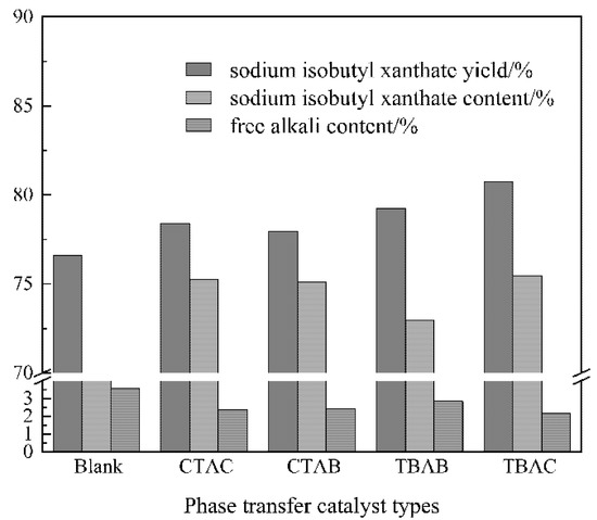 The amount of phase transfer catalyst was 3% malkohol, the reaction temperature was 25 °C, the solvent volume was 3.5 Valcohol, the rotating speed was 120 rpm, the material ratio was n[(CH3)2CHCH2OH]:n(NaOH):n(CS2) = 1:1:1.05, the reaction time was 4 h, and the rotating speed was 120 rpm. Figure 1 shows that the content and yield of sodium isobutyl xanthate in the product are relatively low, and the content of free alkali is relatively high without the addition of catalyst. After adding the catalysts CTAC, CTAB, TBAB and TBAC, the content and yield of sodium isobutyl xanthate in the product are increased, and the content of free alkali is reduced. Among the four catalysts, TBAC has the greatest impact on product quality, the content and yield of sodium xanthate are relatively highest, and the content of free alkali is relatively lowest. TBAC has excellent properties of molecular symmetry and anion hydrophilicity, the ion exchange effect is relatively good, which greatly increases the chance of collision between (CH3)2CHCH2O− and CS2, and the product purity is relatively high. The results show that the presence of the catalyst optimizes the effect of the reaction under certain conditions.
