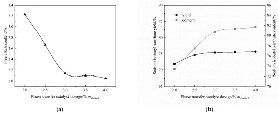 The effect of catalyst dosage: (a) The content of free alkali; (b) The content and yield of sodium isobutyl xanthate.