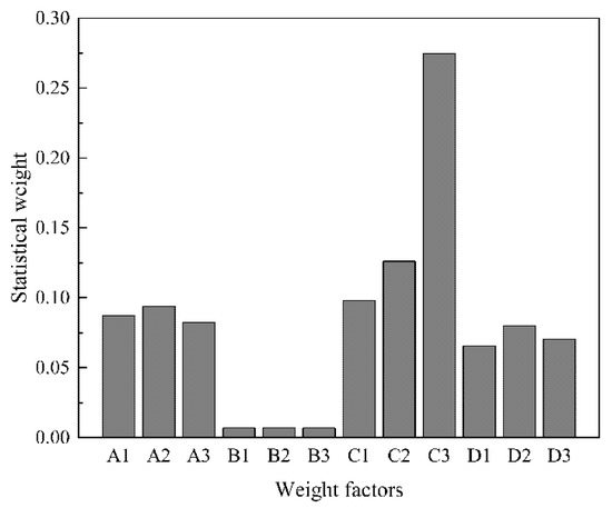 An orthogonal experiment was designed and a three-layer structure model was established based on its data structure. As shown in Table 2, the first layer was the investigation index layer, the second layer was the factor layer and the third layer was the horizontal layer. The index layer matrix M, the factor layer matrix T, the horizontal layer matrix S and the weight matrix w were established that affected the experimental index value [33,34].