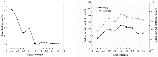 The effect of reaction time: (a) The content of free alkali; (b) The content and yield of sodium isobutyl xanthate.