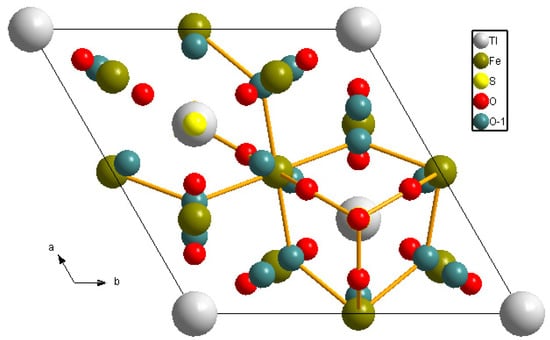 Dorallcharite (TlFe3+3(SO4)2(OH)6) is the Tl-analog of jarosite; it was initially found in Allchar of North Macedonian and thereafter in France [142] and Switzerland [49]. The crystal structure for dorallcharite is presented in Figure 2. Dorallcharite occurs associated with gypsum, rosselrite (MgHAsO4·7H2O), thalliumpharmacosiderite (TlFe4[(AsO4)3 (OH)4]·4H2O), and amorphous Fe and Mn sulfate and/or arsenate at Allchar [101]. The mean concentration of Tl and K from 25 microprobe measurements is 23% and 1.23%, respectively [143]. It is formed following Tl removal from sulfide oxidation and subsequently retained by the sulfate [101]. Given that Tl+ substitutes K+ in jarosite, a complete solid-solution series exists between jarosite and dorallcharite [101].