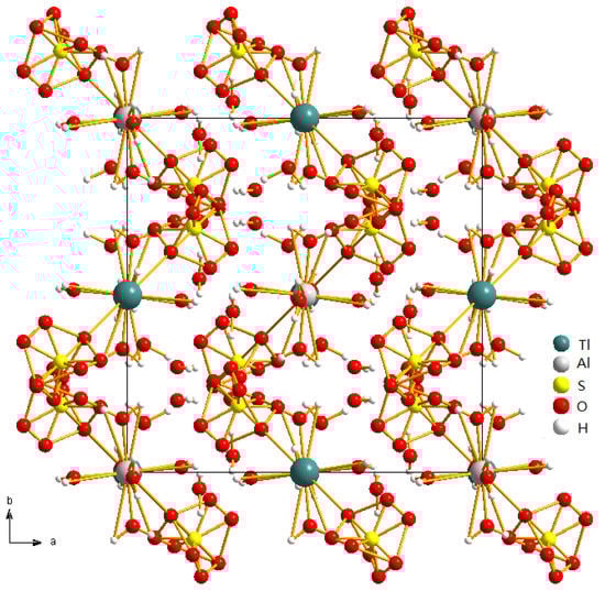 Lanmuchangite (TlAl(SO4)2·12H2O) is the Tl-analog of alunite. It is only reported in its type locality, China [68], which is associated with melanterite, pickeringite, alum, jarosite, gypsum, native sulfur, arsenolite, and some unknown minerals in the oxidized zone of the Lanmuchang Hg-Tl deposit [68]. It belongs to the alum group with the general formula X+Al3+(SO4)2·12H2O in which X site is occupied by Na, K, NH4, and Tl. The crystal structure of the mineral is given in Figure 3. Biagioni et al. [35] documented Tl-bearing alum (K) from the Apuan Alps in Italy and argued that the substitution of Al3+ by Fe3+ and K+ by both NH4+ and Tl+ are responsible for the nonlinear variation of the unit-crystal parameter from Alum(K) to lanmuchangite.