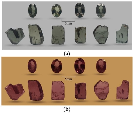 We collected 10 samples of colour-changing garnets, four oval faceted gems (dimensions from 3 mm × 5 mm to 4 mm × 5.7 mm) and six double-sided polished flats with a thickness of 3 mm. They appeared gray-green under daylight (Figure 1a) and purplish red under incandescent light (Figure 1b), showing a distinct colour-changing effect.