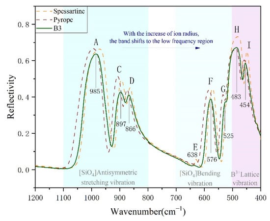 The infrared spectra of the garnets are shown in Figure 2. Vibrations inside the [SiO4]4− group produced the A–G absorption bands above 500 cm−1. The A–D absorption zone (bands in the range 800–1100 cm−1) is due to the antisymmetric stretching vibration of the [SiO4] tetrahedron, and is caused by the splitting of the υ3 triplet degenerate inside [SiO4]. The E–G absorption zone relates to the antisymmetric bending vibration of [SiO4], and shows a peak at 500–700 cm−1 due to double-degeneracy splitting of υ2 or triple-degeneracy splitting of υ4. External vibrations, namely lattice vibrations, produce the H–K absorption band, below 500 cm−1. The H–I absorption bands within this are related to vibrations of the trivalent cation (B3+), and the J–K absorption band to vibrations of the divalent cation (A2+) [36,37]. In the lattice of the garnets, the volume of the octahedral [BO6] group is higher than that of [SiO4], and the B-O bond is weaker than the Si-O bond. This is reflected in the decrease in the bond force constant K in the infrared spectra, and leads to the absorption band appearing in the low-frequency region [36].