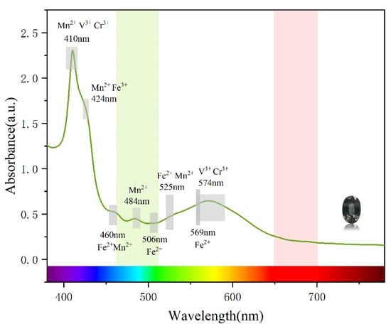 The UV-visible spectrum of the colour-changing garnet is shown in Figure 4. Four weak absorption peaks are present in the blue-green region. The absorption at 525 nm and 460 nm correspond to Mn2+ and the spin-forbidden transitions of Fe2+ (5Eg-3T1g and 5Eg-3E1g). The absorption at 506 nm corresponds to spin-forbidden transitions of Fe2+, 484 nm corresponds to Mn2+, and 424 nm corresponds to Mn2+ and six-fold spin-forbidden transitions of Fe3+ (6A1g-4A1g and 6A1g-4Eg). The three absorption bands of Fe3+ in the yellow-green area showed the typical absorption pattern of the “iron–aluminum window” in the spectroscope [40,41,42,43,44].
