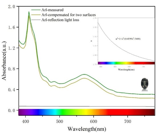 Accurate visible spectroscopic measurements rely on correctly identifying the spectral baseline. A relatively clean place in the interior was selected for the UV-Vis spectrum test to eliminate loss due to the scattering of light caused by inclusion. Sample B3 is used as an example. The spectrum after baseline correction by the Sellmeier equation is shown in Figure 5. The green line represents the original spectrum, the yellow line the absorption spectrum after baseline correction, and the gray line, which is approximately a straight line, represents absorption caused by boundary reflection.