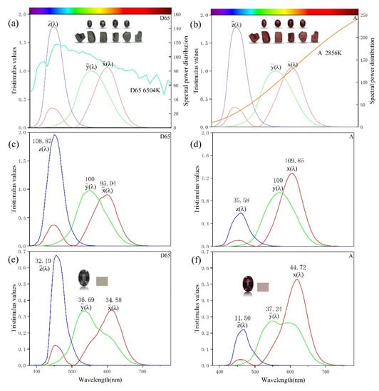The colour of transparent gems can be calculated according to the spectra of the light source and the transmission spectra of the gems. The integral of the curve of spectral response corresponds to the signal emitted by cones of the human eye. The spectra of responses of the cones, the illuminants, and the transmittance of the stones are combined to determine the perception. Figure 6 shows spectral responses of the CIEXYZ colour-matching functions. In Figure 6c,d, the products of the illuminant spectra and the spectra of the colour matching functions are plotted. The integrals of these curves correspond to signals sent by the cones, and their values are marked (D65: X = 95.04, Y = 100, Z = 108.87; A: X = 109.85, Y = 100, Z = 35.58). These are approximately the colours of white objects perceived under the two light sources. The spectral response curve obtained in Figure 6c,d is multiplied by the transmission spectra (T(λ)) of garnet to obtain the colour of the gems under the D65 and A light sources by integrating the response curve (Figure 6e,f) (data on the CIEXYZ colour-matching functions were obtained from the official CIE website [48]).