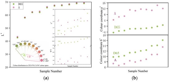 Comparison of colour parameters under two kinds of standard light sources. (a) Comparison of lightness L*, chroma C*, and hue angle h(°); (b) Comparison of colorimetric coordinates a* and b*.
