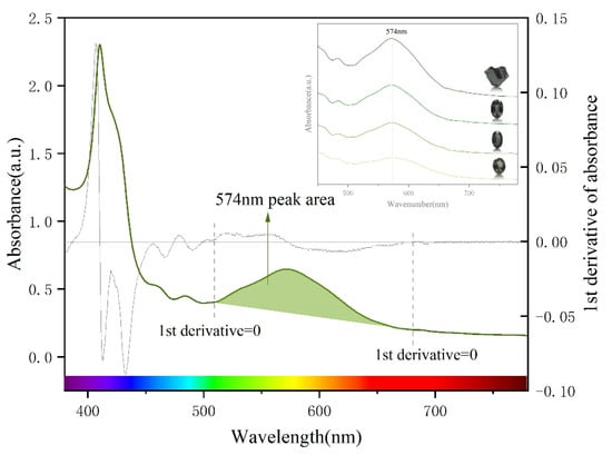 The strong absorption band at 574 nm in the UV-Vis spectrum plays a decisive role in determining the colour of a colour-changing garnet [39]. The first derivative of the UV-Vis spectrum is calculated, and points with a zero derivative near 510 nm and 680 nm are selected as starting and ending points, respectively, for calculating the peak area of absorption at 574 nm (Figure 9).