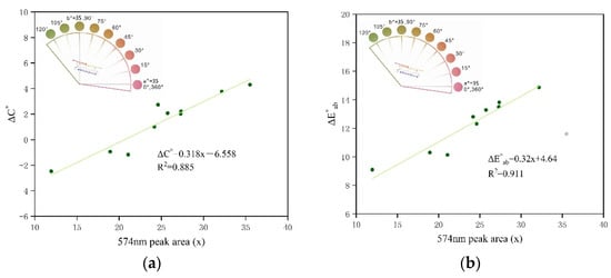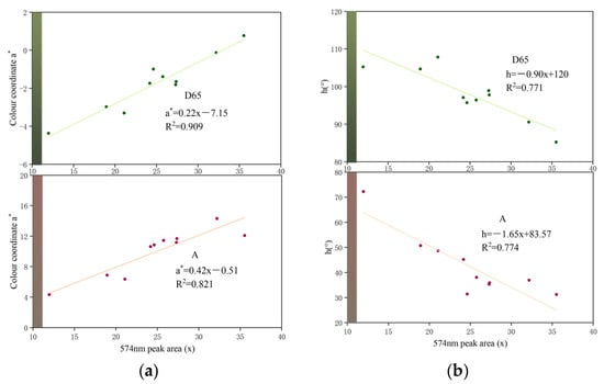 The results show that the colorimetric coordinate a* is positively correlated with the area of the peak at 574 nm (D65: R2 = 0.909; A: R2 = 0.821, Figure 10a). With the increase in the area, the colorimetric coordinate a* gradually increases, that is, the concentration of green decreases under the D65 light source, and the concentration of red increases under the A light source.