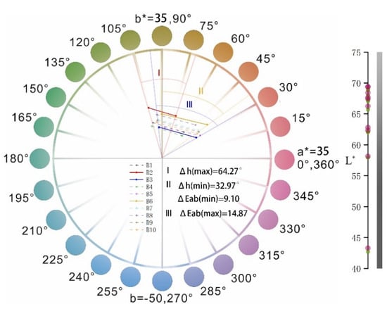The CIE1976 La*b* colour space is the most widely used in the field of colourimetry. The system consists of the axes of plane chromaticity a* and b*, and the vertical axis L*. +a* represents red, −a* represents green; +b* represents yellow, and −b* represents blue. The chroma C* and hue angle h(°) can be calculated from the chromaticities a* and b* [32,34]: