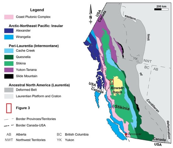 The North American Cordillera in western Canada is made up of five tectonic realms that are from east (oldest) to west (youngest): Ancestral North America (Laurentia), Intermontane Belt (peri-Laurentia) with Coastal Plutonic Complex, Arctic and Insular Terranes, and late accreted Pacific Terranes (Figure 1; e.g., [8,24]). The latter is more prominently developed in Alaska, and hence, not shown in Figure 1. Of these predominantly north-south trending terranes, the Intermontane Belt is a complex collage of arcs, back-arcs, rifts, collisional environments, and sedimentary basins formed during the late-Paleozoic to early-Mesozoic (e.g., [8,25,26,27]). The largest of these terranes is the Stikine terrane (Stikinia) that extends for ca. 1000 km from southern British Columbia to the Yukon, flanked to the east by the Cache Creek terrane and to the west by the Coastal Plutonic Complex (Figure 1). Stikinia consists of Paleozoic to Mesozoic bimodal volcanic rocks, their plutonic counterparts, and siliciclastic and biologic sedimentary rocks (e.g., [4,6,28,29]). Stratigraphically, four assemblages and groups make up Stikinia, which are, from oldest to youngest: (1) Paleozoic Stikine assemblage, consisting of volcano-sedimentary rocks and limestone; (2) Triassic Stuhini Group, consisting of mostly mafic volcano-sedimentary rocks; (3) Early to Middle Jurassic Hazelton Group, consisting of mafic to felsic volcano-sedimentary rocks; and (4) Middle Jurassic to Early Cretaceous Bowser Lake Group, consisting of sedimentary rocks; (e.g., [4,6,12,28,29,30,31]).