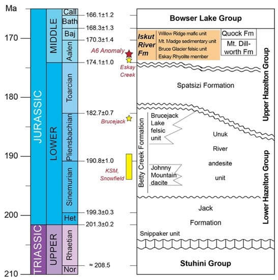 Stratigraphy of the Hazelton Group in the Iskut River area. Yellow stars and bar show the age of the deposits in this region, while the red star shows the U-Pb zircon age of altered felsic flows at the A6 Anomaly, Iskut River Formation (light orange is the stratigraphic level of interest in this study); see Table 1 for more detailed information on the age of mineral deposits, modified after Nelson et al. [6], with a stratigraphic chart after Cohen et al. [32]. Abbreviations: Baj—Bajocian, Bath—Bathonian, Call—Callovian, Fm—Formation, Het—Hettangian, Nor—Norian.