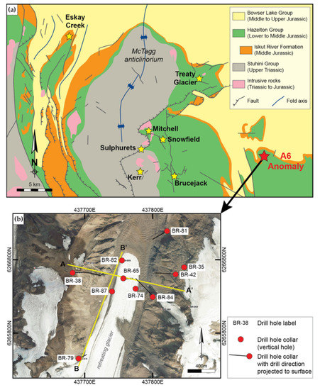 Geological map of study area and map of drill holes at A6 Anomaly. (a) Detailed geological map of Iskut River region with location of Eskay Creek, KSM, Snowfield, Brucejack, and Treaty Glacier deposits (yellow stars) and the A6 Anomaly (red star). In Map b (modified after Lewis [5] and Kirkham and Margolis [34]), the black arrow highlights (b) the location of drill holes at the A6 Anomaly investigated in this study; cross sections for A-A’ and B-B’ are shown in Figure 4. Their stratigraphic section of each drill hole is shown Figure 4, Easting and Northing after UTM NAD83 zone 9. Details about geographic location and depth for each drill hole are summarized in Supplementary Materials Table S1a).