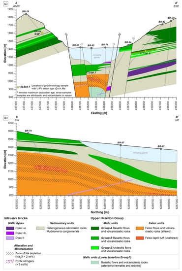 The oldest lithologies are strongly chlorite- and hematite altered, aphanitic basaltic flows, or fine-grained tuff to lapilli tuff (Figure 5a,b) that are at least 160 m thick and occur beneath altered felsic flows below the retreating glacier (Figure 4a). The stratigraphic position of this unit is unclear, since chlorite and hematite alteration are typical for the Betty Creek Formation of the Lower Hazelton Group (e.g., [4,5,6]). However, fine-grained tuffs have been reported in the Upper Hazelton Group at Eskay Creek, specifically below the altered Eskay rhyolite in the Lower Footwall unit (e.g., [40,41]). The contact towards overlying altered flows is sharp and marked by brittle deformation.