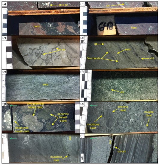 Igneous and epiclastic lithologies at the A6 Anomaly—Part I, (a,b) Hematite ± chlorite altered basaltic tuffs to lapilli tuffs, partly with quartz ± calcite filled amygdules occurring below altered felsic flows (BR-65), (c–f) Quartz-sericite ± chlorite ± pyrite altered felsic flows occurring beneath the retreating glacier, (c) silicified felsic flow with pyrite (BR-79), (d) Quartz-sericite-chlorite altered felsic flow with flow bands of chlorite and sericite (BR-82), (e) Quartz-sericite altered massive felsic flow (BR-82), (f) Quartz-sericite-chlorite altered massive felsic flow (BR-82), (g) Polymictic, poorly sorted cobble conglomerate with subround amygdaloidal, porphyritic, and aphanitic clasts in mudstone matrix conglomerate are not graded; green arrow depicts stratigraphic (BR-35), (h–j) epiclastic sequence ranging from conglomerate to siltstone, (h) Polymictic, poorly sorted pebble conglomerate with relatively well rounded clasts (siltstone, mudstone, rhyolite), conglomerate is not graded; green arrow depicts stratigraphic up (BR-87), (i) Finely bedded siltstone (grey variations) with medium- to coarse-grained sandstone bed containing polymictic epiclastic, subangular clasts including mudstone, sandstone bed is not graded; green arrow depicts stratigraphic up (BR-87), (j) Fine- to medium-grained, non-bedded sandstone alternating with thin carbonaceous and fossil-bearing siltstone to mudstone beds; green arrow depicts stratigraphic up (BR-65). Abbreviations: cc—calcite, chl—chlorite, hem—hematite, py—pyrite, qz—quartz, sas—sandstone, serc—sericite.