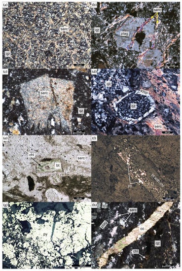 - Thompson, A.J.B.; Thompson, J.F.H. Atlas of Alteration—A field and Petrographic Guide to Hydrothermal Alteration Minerals; Mineral Deposit Division, Geological Association of Canada: St. John’s, NL, Canada, 1996. [Google Scholar]