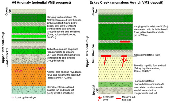 North-west British Columbia is a highly metal-endowed region, often colloquially dubbed the “Golden Triangle”. The area hosts several high-grade mines and deposits including the Kerr-Sulphurets-Mitchell (KSM) porphyry camp, the epithermal Au Brucejack mine, and the Eskay Creek volcanogenic massive sulfide (VMS) deposit, among others. Mineralization in the area is hosted predominantly within the Lower to Middle Jurassic Hazelton Group (e.g., [1,2,3]). Although the area has been the focus of regional campaigns (e.g., [4,5,6]), steep terrain, poor exposures outside of the alpine and rapid facies changes in the volcanic units has made stratigraphic correlations between areas difficult, and hence, hindered exploration efforts to identify exploration targets. Among the known deposits in the region, the majority are porphyry and epithermal deposits formed in a volcanic arc in the Lower Jurassic (e.g., [1,7,8]). In contrast, known VMS deposits are relatively rare and occur predominantly in the southern portion of the “Golden Triangle” (e.g., Triassic Granduc deposit, Jurassic Anyox and Eskay Creek deposits; [9,10]). Nevertheless, more VMS occurrences haven been assumed for the area (e.g., [11,12]). Of particular interest for VMS exploration are lithologies in the Iskut River Formation of the Upper Hazelton Group, as these are interpreted to have formed, in part, in a late-Early to Middle Jurassic back arc rift which is a favorable VMS setting (e.g., [13,14,15,16,17]). The anomalous Au-rich Eskay Creek deposit is interpreted to have formed within a north-south trending back-arc rift (i.e., Eskay rift; [10,18,19]) in the Middle Jurassic. Exploration efforts targeting VMS systems have been following the trend of this rift but with little success so far.