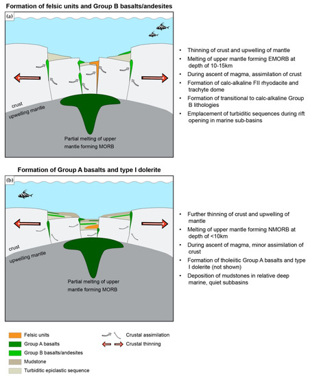 - Lentz, D.R. Petrogenetic evolution of felsic volcanic sequences associated with Phanerozoic volcanic-hosted massive sulphide systems: The role of extensional geodynamics. Ore. Geol. Rev. 1998, 12, 289–327. [Google Scholar] [CrossRef]
