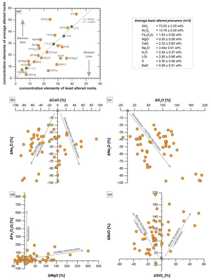 - Leitch, C.H.B.; Lentz, D.R. The Gresens approach to mass balance constraints of alteration systems: Methods, pitfalls, examples. In Alteration and Alteration Processes Associated with Ore-forming Systems; Lentz, D.R., Ed.; Geological Association of Canada: St. John’s, NL, Canada, 1994. [Google Scholar]