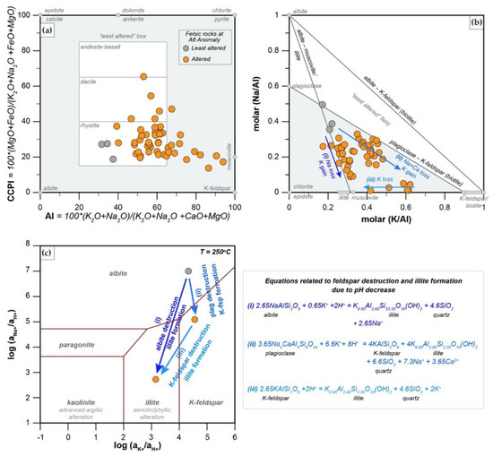 - Davies, J.F.; Whitehead, R.E. Alkali-Alumina and MgO-Alumina Molar Ratios of Altered and Unaltered Rhyolites. Explor. Min. Geol. 2006, 15, 75–88. [Google Scholar] [CrossRef]