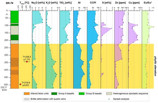Whole rock lithogeochemistry was carried out on all igneous units. Standard optical microscopy and scanned electron microscopy (SEM), X-ray diffraction (XRD), electron microprobe analysis (EMPA), and secondary ion mass spectrometry (SIMS) were carried out on altered felsic units. Sample information is provided in Supplementary Materials Table S1b,c.